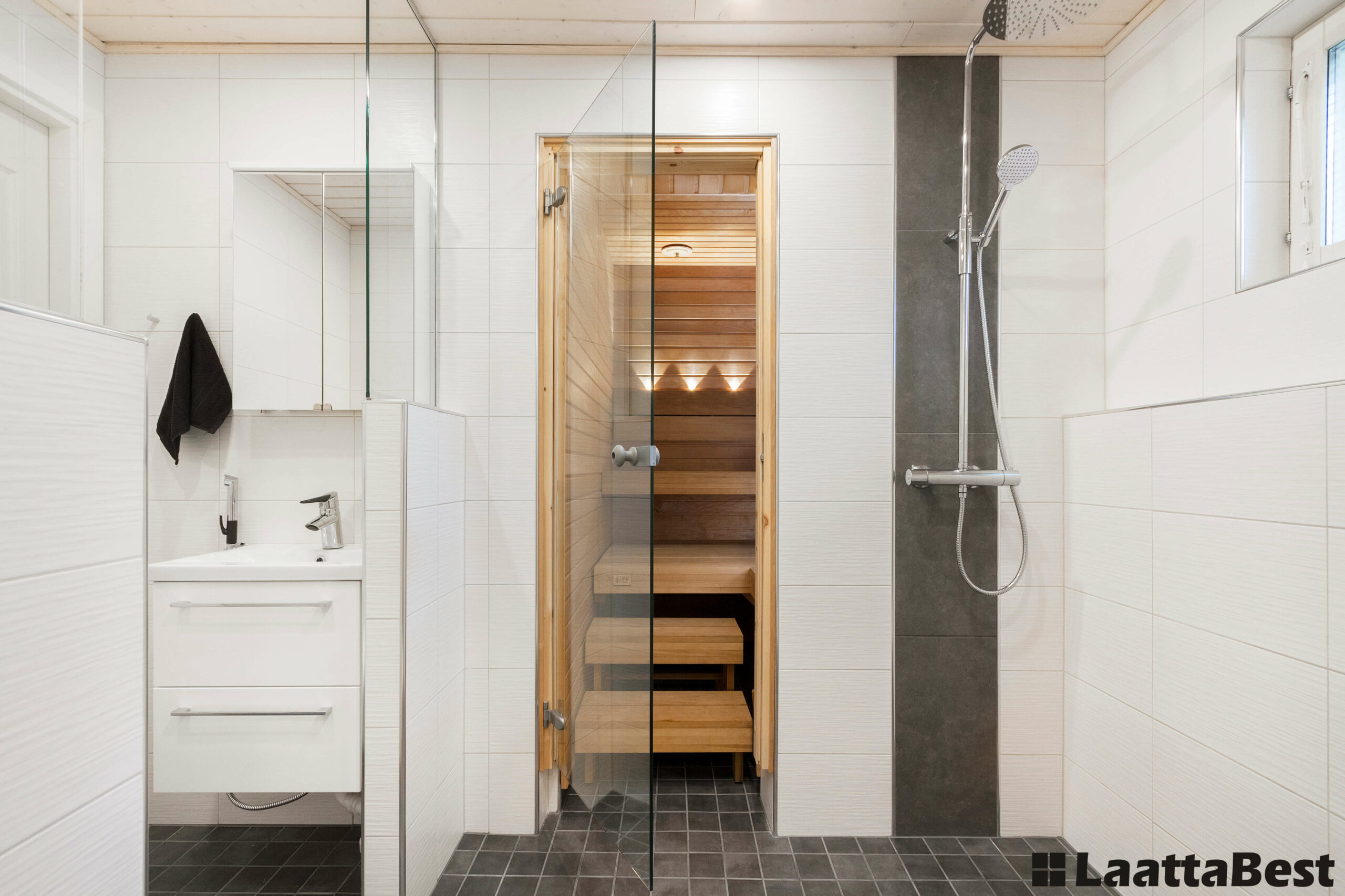 Remonttityyppi: Kylpyhuone, sauna ja pukuhuone uudistettiin