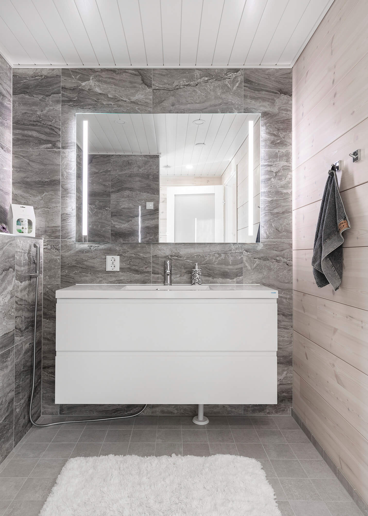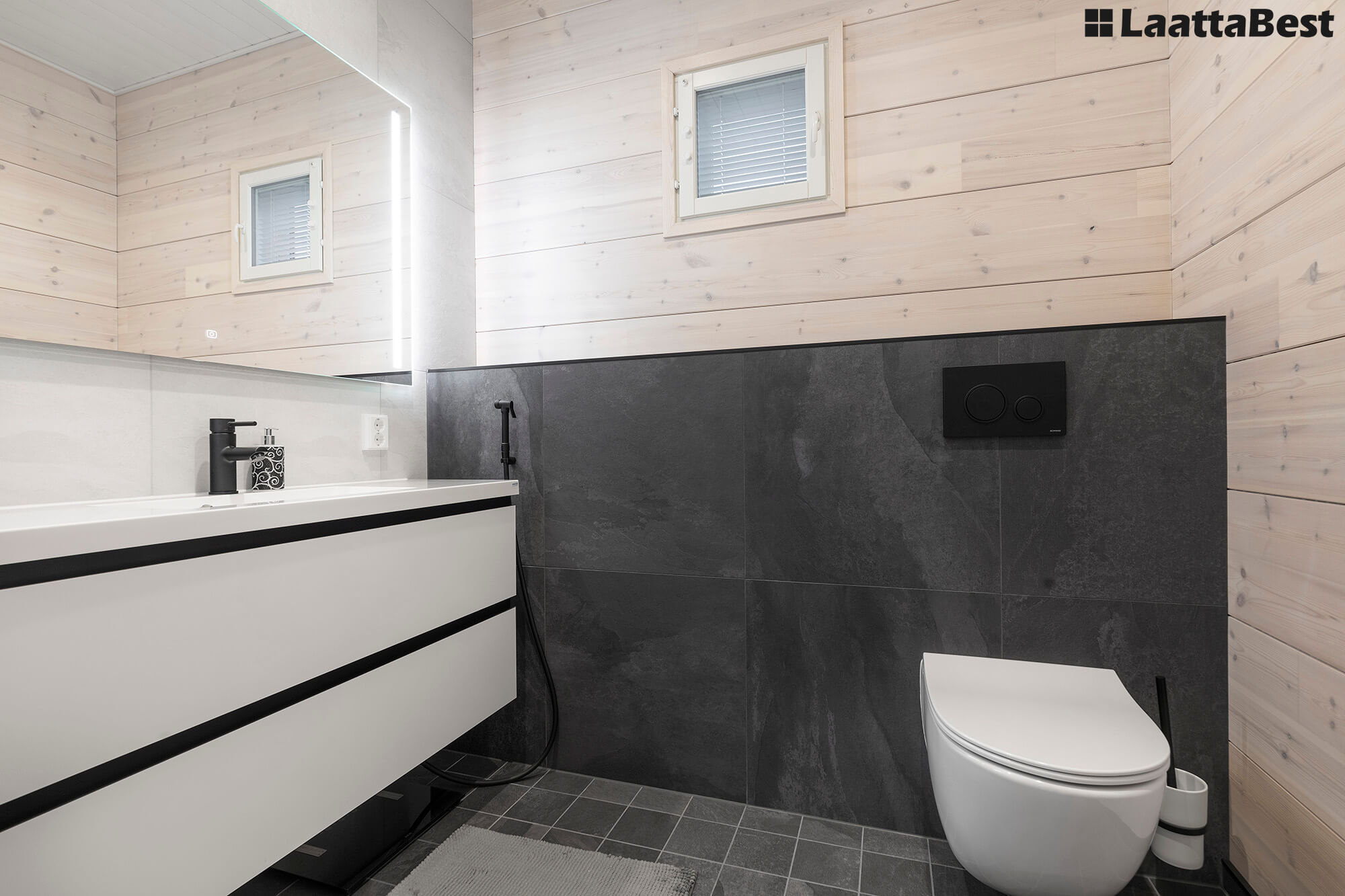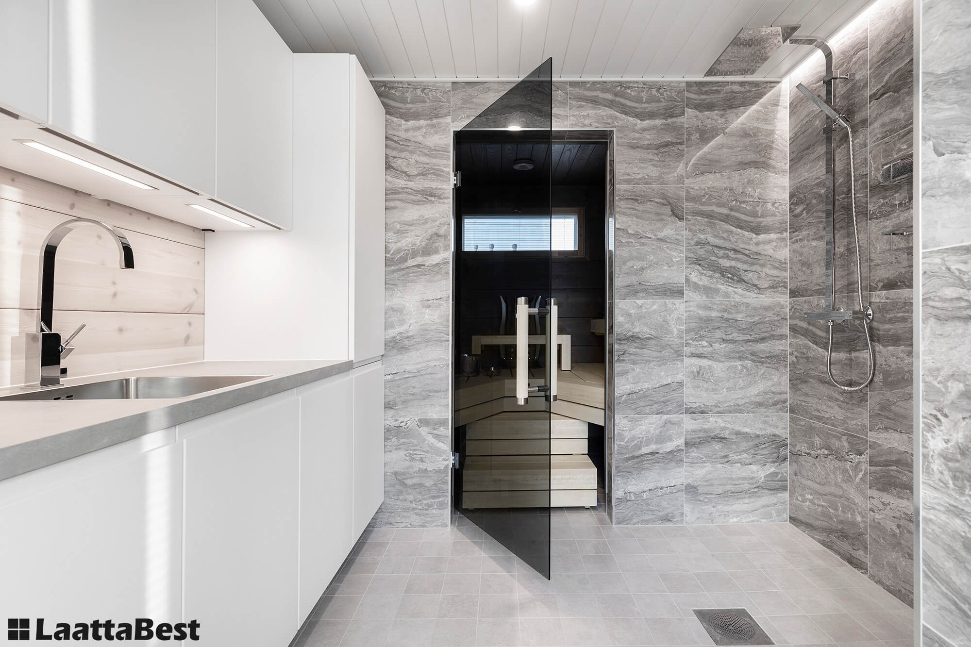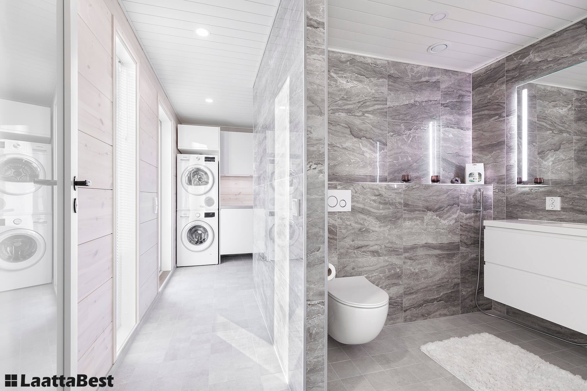 Hirsitalo Hyvinkää. Hulppeat sauna, kylpyhuone, kodinhoitohuone ja WC-tilat.