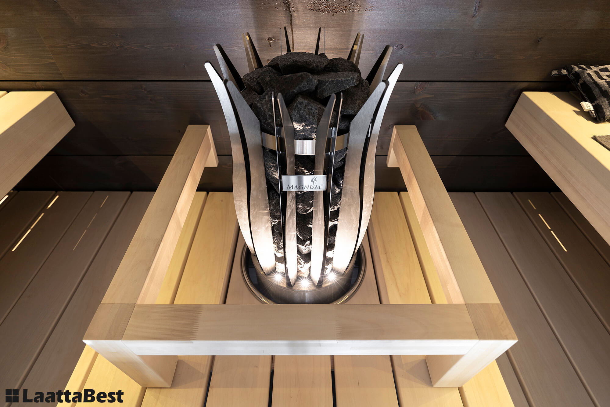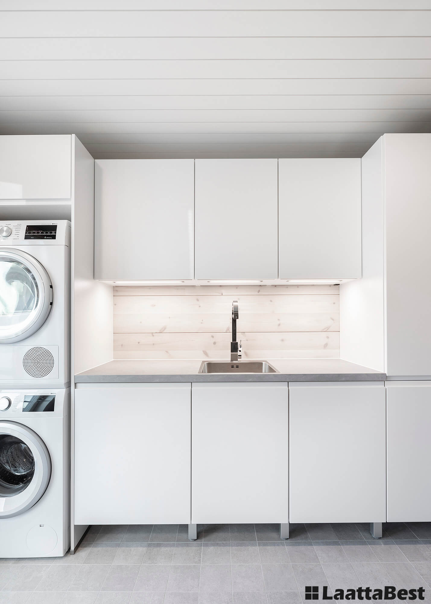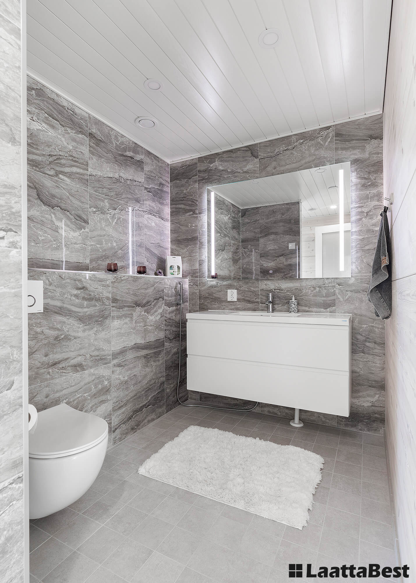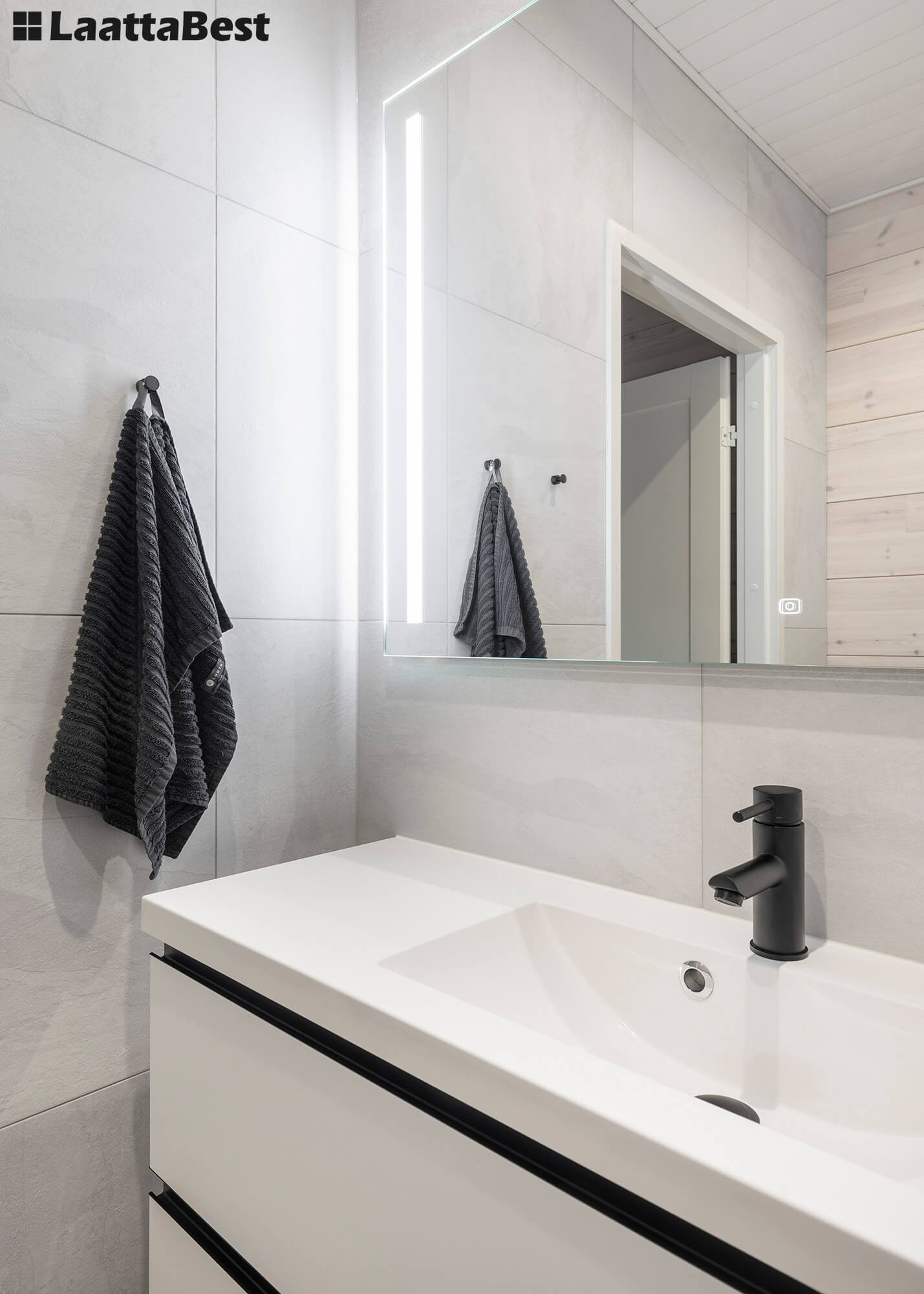 Hirsitalo Hyvinkää. Hulppeat sauna, kylpyhuone, kodinhoitohuone ja WC-tilat.
