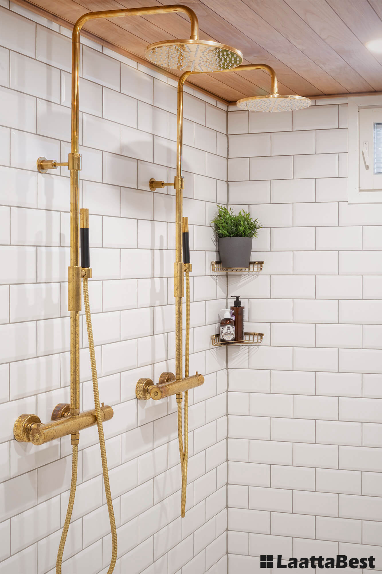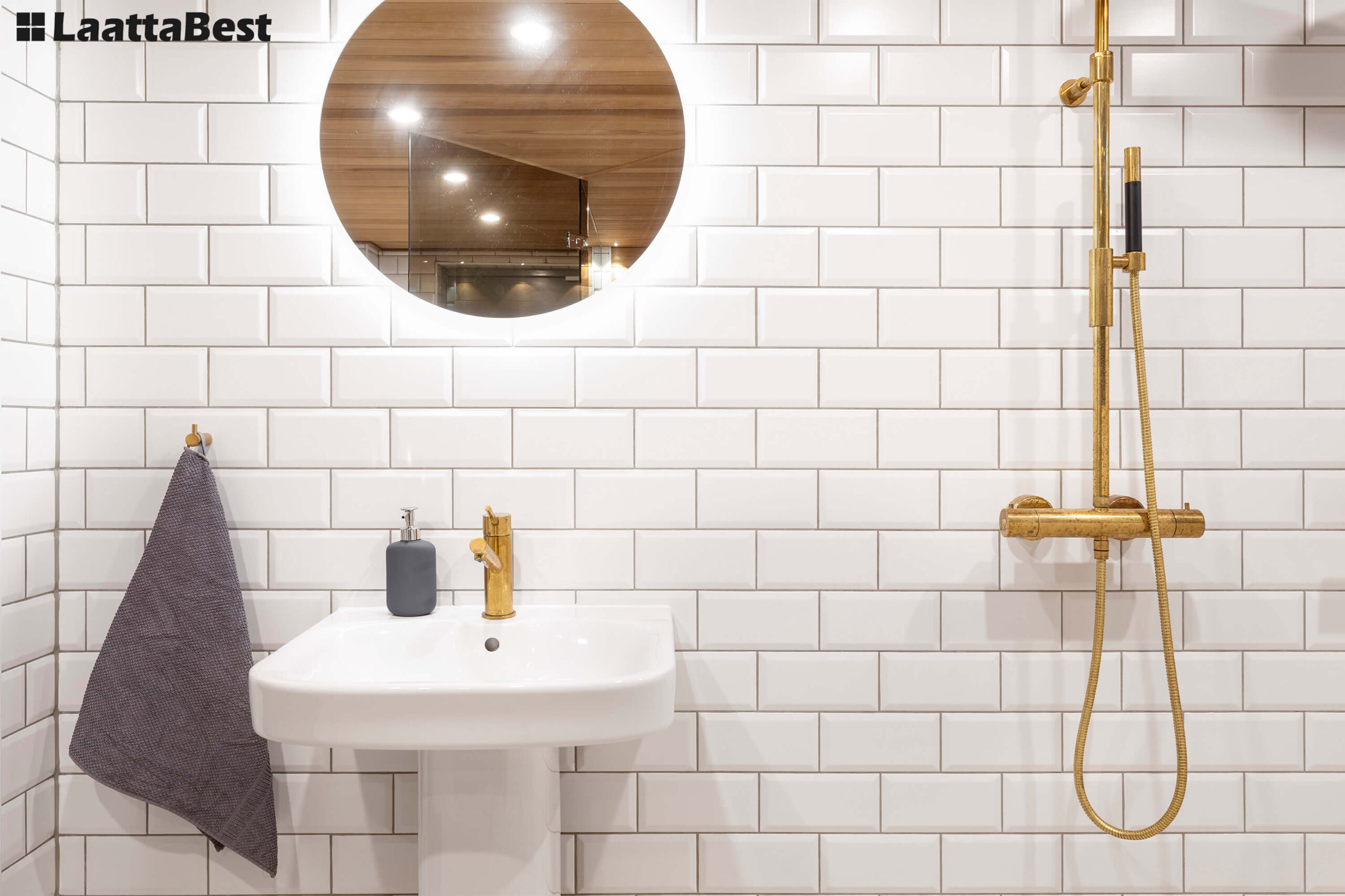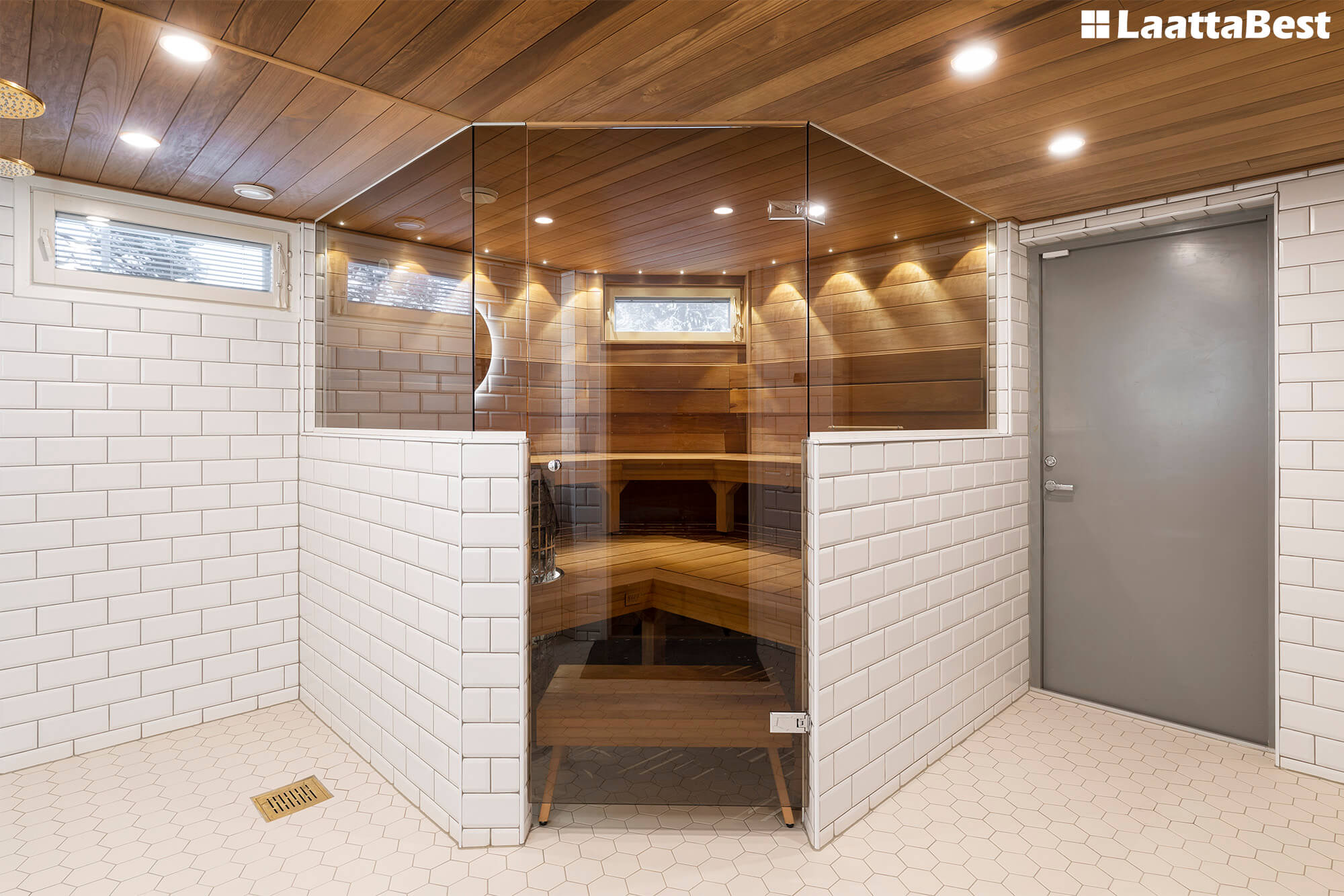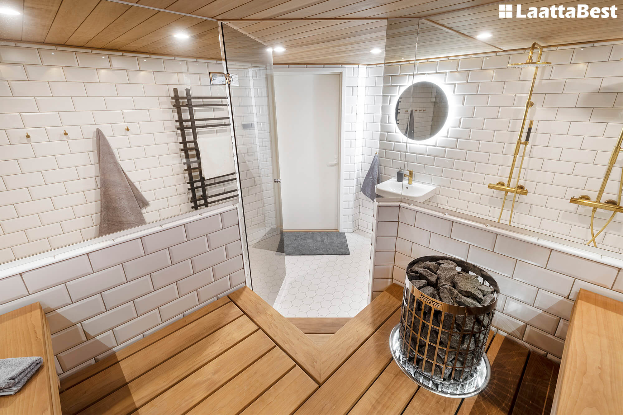 Alakerran tiloihin uusittiin sekä pesuhuone että sauna, Tuusulassa sijaitsevaan omakotitaloon. Hienoja yksityiskohtia.