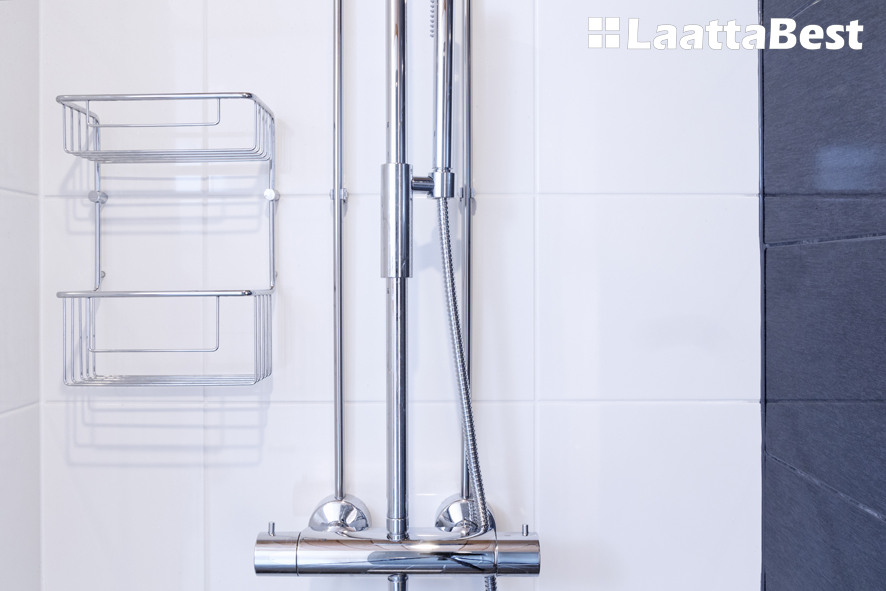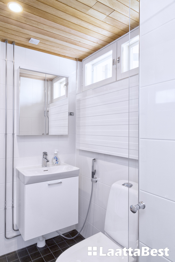 80-luvun rivitalossa uusittiin pesutilat täysin. Tyylikäs muutos. Harvian tornikiuas tuo makoisat löylyt.