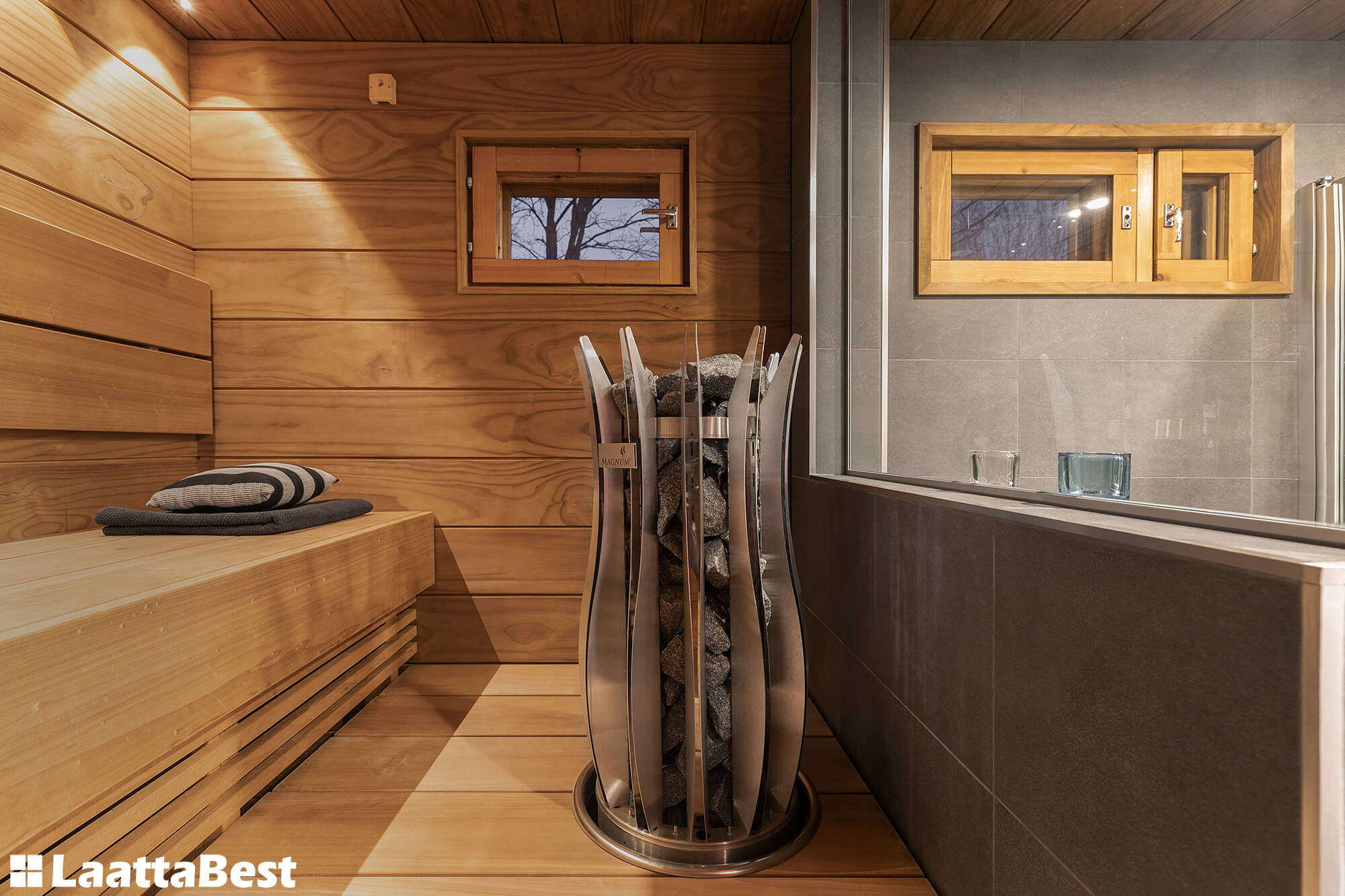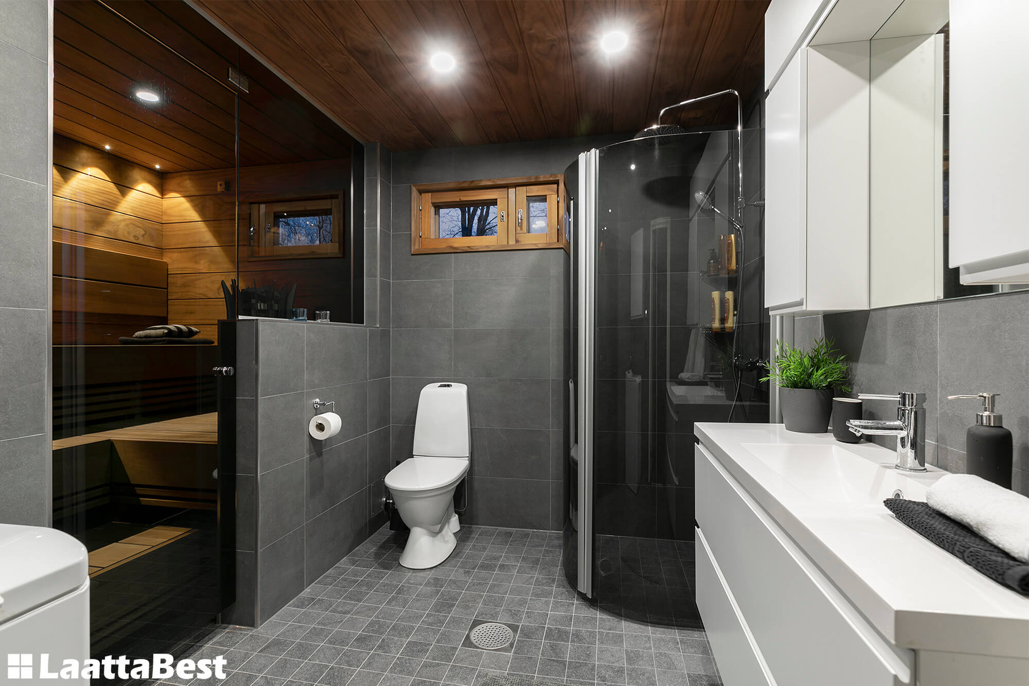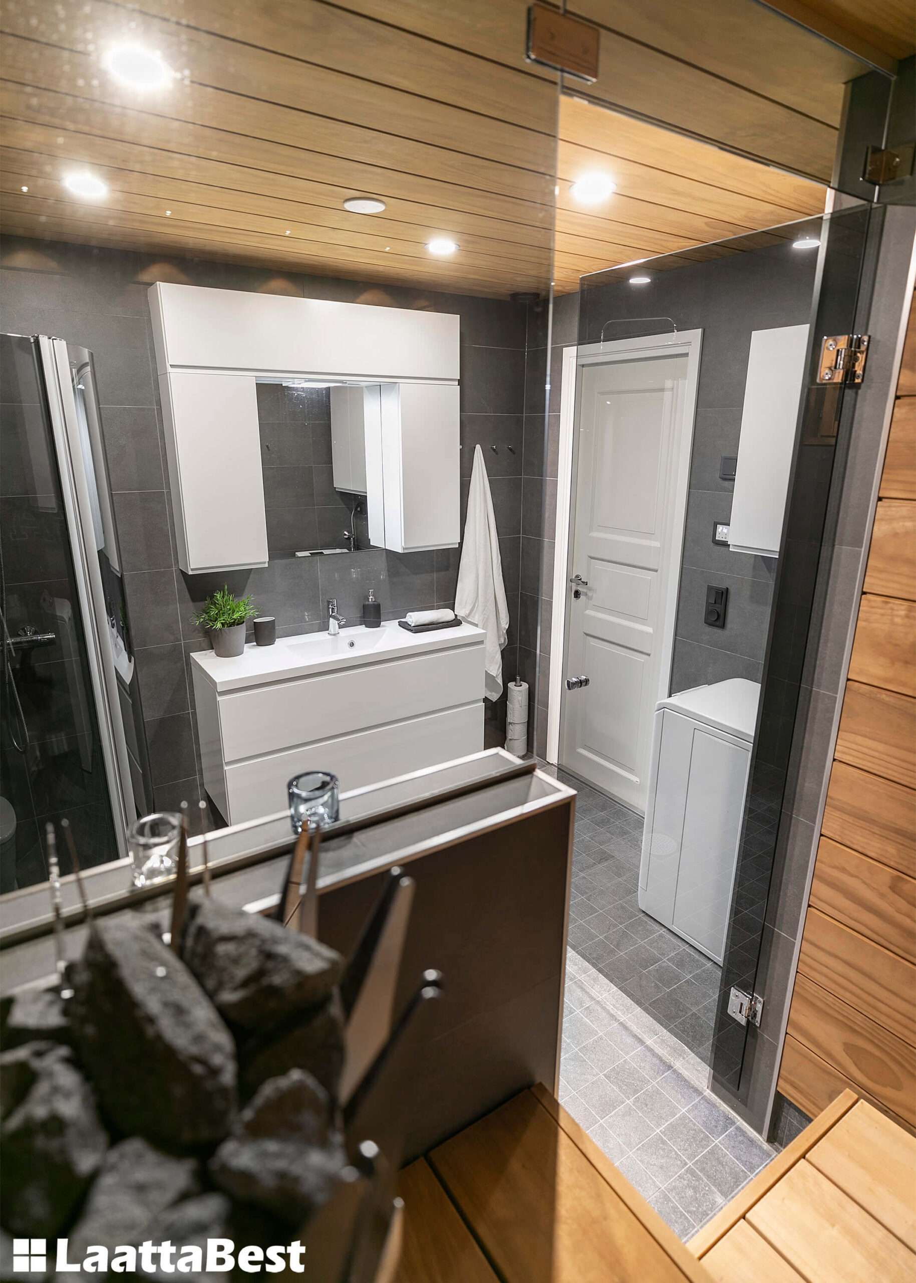 Radiata-paneelit ( 185 mm) kylpyhuoneessa ja saunassa.